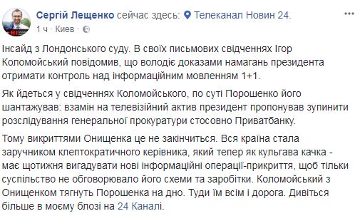 Народный депутат от БПП Сергей Лещенко заявил, что олигарх Игорь Коломойский в Лондонском суде дал показания против президента Украины Петра Порошенко.