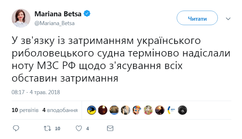 "В связи с задержанием украинского рыболовецкого судна срочно направили ноту МИД РФ для выяснения всех обстоятельств задержания", - написала она.