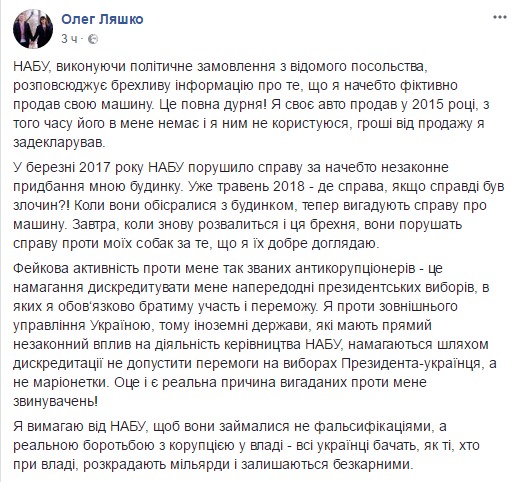 "Я свое авто продал в 2015 году, с тех пор его у меня нет и я им не пользуюсь, деньги от продажи я задекларировал. В марте 2017 НАБУ возбудило дело за якобы незаконное приобретение мной дома. Уже май 2018 - где дело, если было преступление?! Когда они обоср*лись с домом, теперь придумывают дело о машине. Завтра, когда снова развалится и эта ложь, они возбудят дело против моих собак за то, что я за ними хорошо ухаживаю. Фейковая активность против меня так называемых антикоррупционеров - это попытка дискредитировать меня в преддверии президентских выборов, в которых я обязательно буду участвовать и одержу победу. Я против внешнего управления Украиной, поэтому иностранные государства, имеющие прямое незаконное влияние на деятельность руководства НАБУ, пытаются путем дискредитации не допустить победы на выборах президента-украинца, а не марионетки. Это и есть реальная причина вымышленных против меня обвинений! Я требую от НАБУ, чтобы они занимались не фальсификациями, а реальной борьбой с коррупцией во власти - все украинцы видят, как те, кто у власти, разворовывают миллиарды и остаются безнаказанными", - написал он.