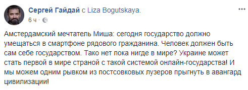 "Амстердамский мечтатель Миша: сегодня государство должно умещаться в смартфоне рядового гражданина. Человек должен быть сам себе государством. Такого нет пока нигде в мире? Украине может стать первой в мире страной с такой системой онлайн-государства! И мы можем одним рывком из постсовковых лузеров прыгнуть в авангард цивилизации!" - подписал снимки Гайдай.