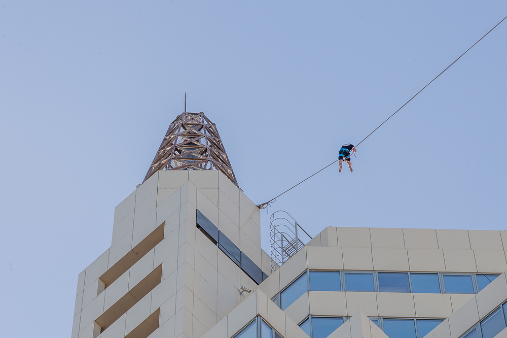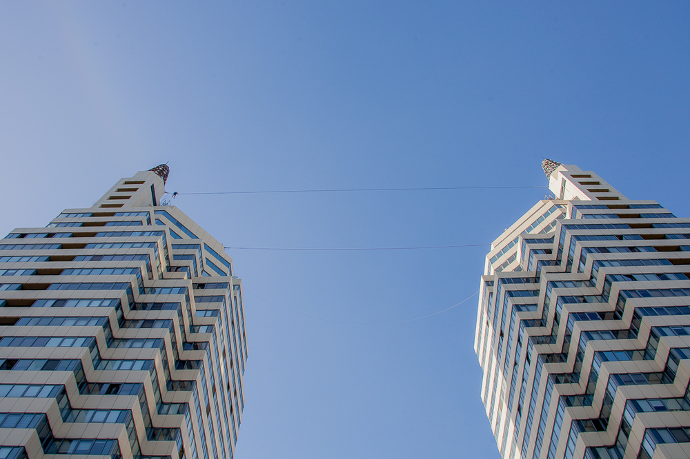 Так, между днепровскими "Башнями" на высоте 94 метров натянули 63-метровую стропу. Экстремалы Станислав Панюта и Константин Карноза прошли рекордную дистанцию и установили национальный рекорд.
