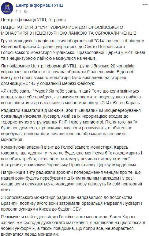 На видео, опубликованном в Facebook УПЦ, группа из примерно 20 националистов требует от монахов выдать нынешнее местонахождение бразильца Рафаэля Лусварги, который, по их информации входил в "ДНР" и жил в монастыре.