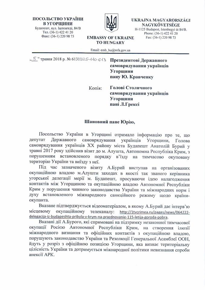 По информации посольства, на мероприятиях в аннексированом Крыму он выступал как "глава" венгерской делегации мэрии Будапешта.