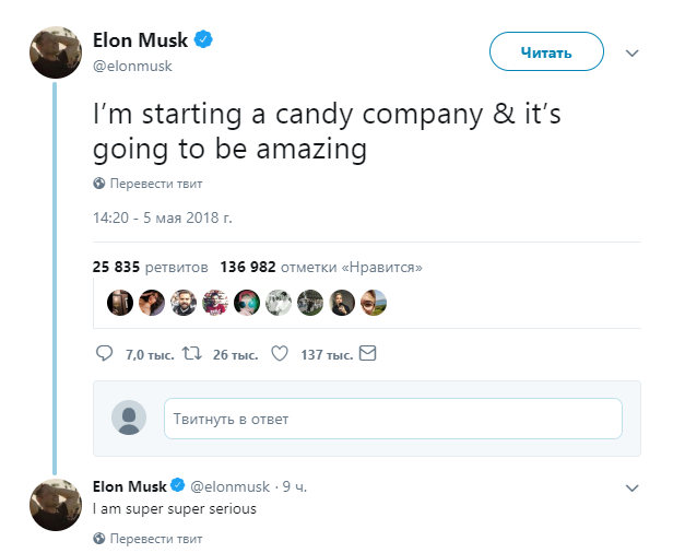 "Я открываю конфетную компанию, и это будет потрясающе", - написал Маск.