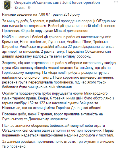 Также, по данным разведки, противник понес следующие потери: трое убитых и пятеро раненых.