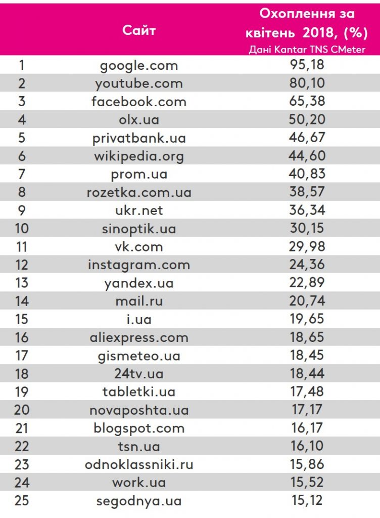 Опубликован свежий срез самых популярных сайтов украинского сегмента интернета за апрель 2018 года.