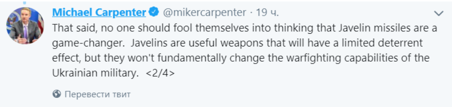 "Нельзя обманывать себя мыслью о том, что ракеты Javelin поменяют правила игры", - написал он в Твиттере. - Они являются полезным видом вооружения, которое будет иметь ограниченный сдерживающий эффект, но не изменит фундаментально возможности украинской армии", -  отметил Карпентер.