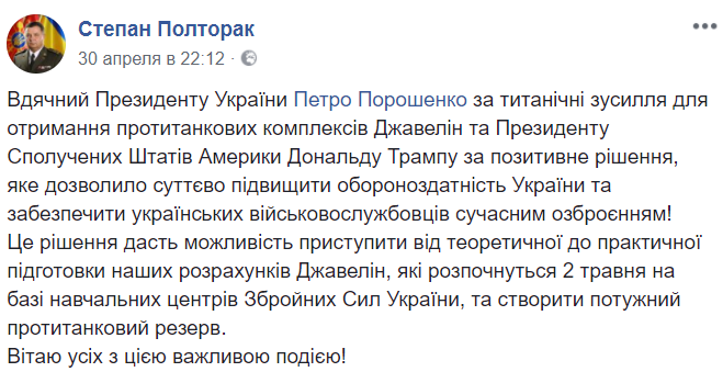 "Это решение (поставить Киеву "Джавелины" - ред.) позволит приступить от теоретической к практической подготовке наших расчетов "Джавелин", которые начнутся 2 мая на базе учебных центров Вооруженных Сил Украины и создать мощный противотанковый резерв", - написал министр в Facebook.