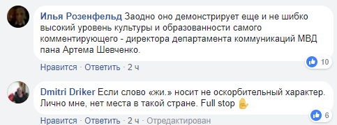 В соцсети пользователи обсуждают комментарий директора департамента коммуникаций МВД Артем Шевченко, который заявил, что антисемитское высказывание главы одесской ячейки "Правого сектора" не содержит прямого призыва к дискриминации по национальному признаку.