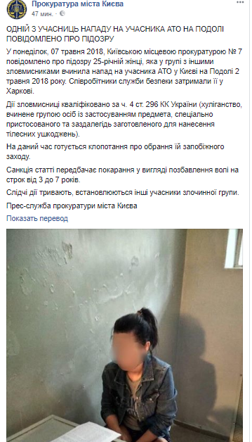 В понедельник, 7 мая, в Киевской местной прокуратурой № 7 сообщили о подозрении 25-летней женщине, которую подозревают в том, что она вместе с сообщниками в Киеве напала на участника АТО Дмитрия Иващенко (позывной Вербич).