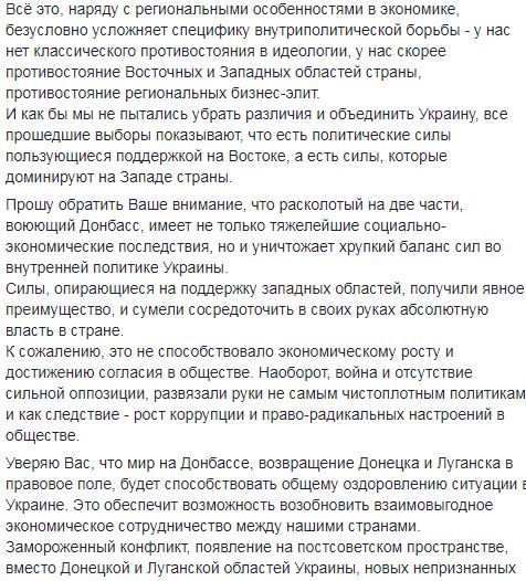 Уверяю Вас, что мир на Донбассе, возвращение Донецка и Луганска в правовое поле, будет способствовать общему оздоровлению ситуации в Украине. Это обеспечит возможность возобновить взаимовыгодное экономическое сотрудничество между нашими странами.
