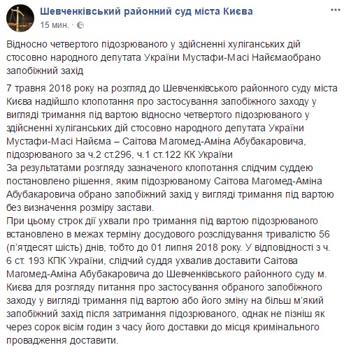Об этом сообщает на Facebook-странице суда. Напомним, ранее стало известно, что сооснователь промоутерской компании BoomBox Promotions Магомед-Амин Саитов, подозреваемый в избиении народного депутата от "Блока Петра Порошенко" Мустафы Найема, отпущен на свободу правоохранителями Азербайджана.