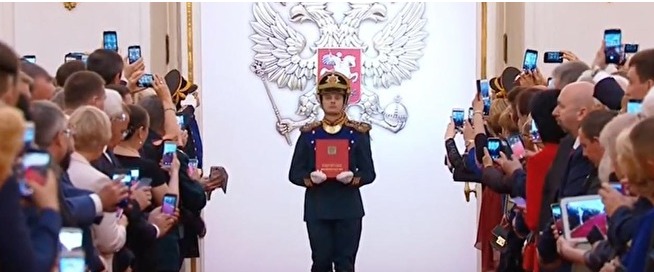 Непривычная картинка: люди в Большом Кремлевском дворце не застыли с торжественно-испуганными выражениями лиц, а активно снимают происходящее на телефоны. Кто-то даже пытается делать селфи в то время, как Владимир Путин идет по красной дорожке. Некоторым из наблюдателей это показалось раздражающим ("А как же сакральность власти?"), а кому-то понравилось (гостей не стали мучить ограничениями, проявив либерализм). В целом, на наш взгляд, получилась интересная картинка, сочетание традиции и модерна.