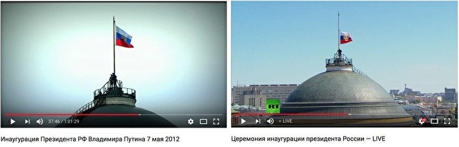После вступления президента в должность над Кремлем должны были поднять дубликат президентского штандарта. Режиссер телетрансляции показывал, как военнослужащие на крыше дворца поднимают флаг, однако в какой-то момент стало похоже, что он застрял, и к окончанию пения гимна финального положения флага - на вершине флагштока - так и не показали. Телеграм-канал "Методичка" предположил, что из-за технической проблемы поднять штандарт не удалось. Комендант московского Кремля генерал-лейтенант Сергей Хлебников заявил, что никаких проблем не было.
