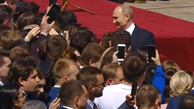 Выйдя на улицу, Владимир Путин принял короткий парад президентского полка и пошел общаться с молодежью - волонтерами, членами патриотических организаций, сотрудниками его избирательных штабов. Молодые люди кричали ему "Поздравляем" и бесконечно благодарили.