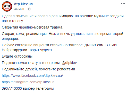 "Сделал замечание и попал в реанимацию: на вокзале мужчине всадили нож в голову. Открытая черепно-мозговая травма. Скорая, кома, реанимация. Нож извлечь удалось лишь во время второй операции. Сейчас состояние пациента стабильно тяжелое. Дышит сам. В НИИ нейрохирургии творят чудеса. Будьте осторожны", - указано в опубликованном сообщении.