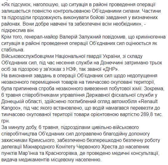 "Боевые действия продолжались по всей линии соприкосновения. Противник 80 раз нарушал Минские договоренности", -заявил Залужный и добавил, что наиболее активные боевые действия продолжались в районах населенных пунктов Крымское, Новотошковское, Луганское, Авдеевка, Пески, Троицкое, Широкино.