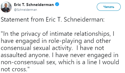 Заявление Шнейдермана появилось и на его странице в Тwitter.