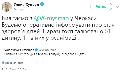 Гройсман и Супрун выехали в Черкассы разбираться с массовым отравлением детей