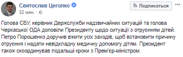 Пресс-секретарь Президента также отметил, что глава СБУ, руководитель Госслужбы по чрезвычайным ситуациям и глава Черкасской обладминистрации доложили Порошенко о ситуации с отравлением детей в Черкассах.