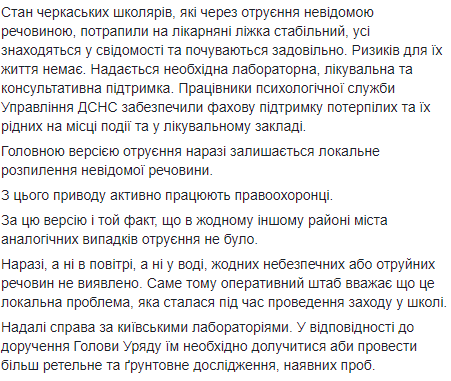 "По состоянию на 7:00 9 мая на лечении в Черкассах находится 57 человек (53 ученика и 4 учителя), из них: 11 - в реанимации в состоянии средней тяжести, остальные в удовлетворительном и легком состоянии", - говорится в сообщении.