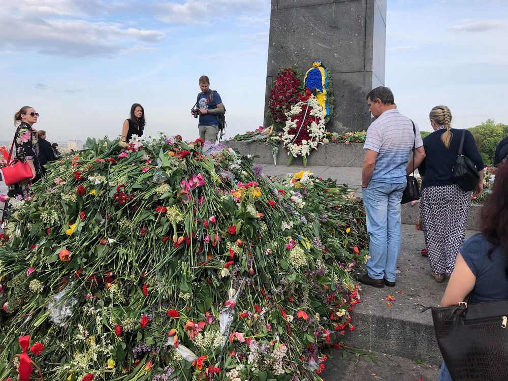 Сегодня, 9 мая, когда Украина отмечает День Победы, у Вечного огня в Киеве собралось огромное количество цветов, которые люди принесли в память о героях.