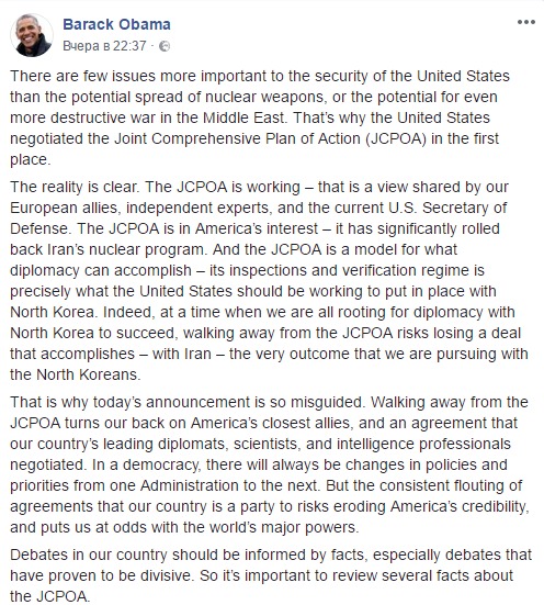 Бывший президент США Барак Обама, во времена которого был подписан Совместный всеобъемлющий план действий (JCPOA, Иранское ядерное соглашение), заявил, что решение президента Трампа выйти из соглашения подтолкнет к началу новой войны в нестабильном регионе. Об этом он написал на официальной странице в Facebook.