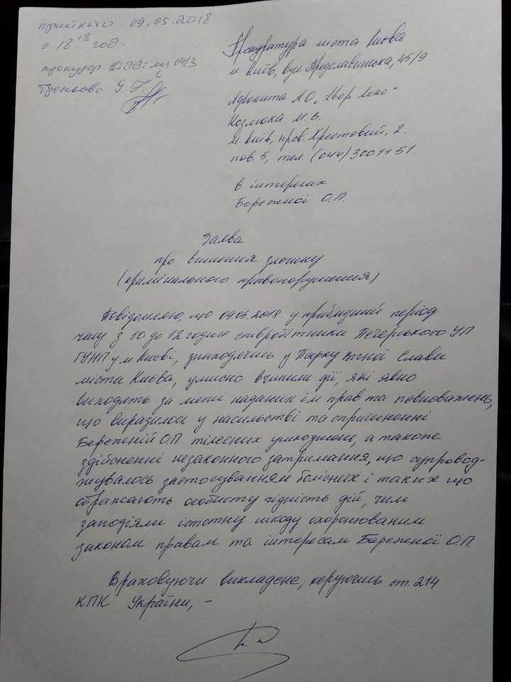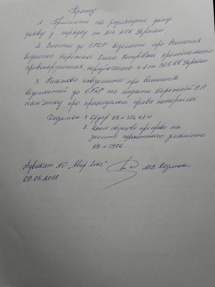 "По факту совершения сотрудниками полиции относительно Елены Бережной преступления, предусмотренного ч. 2 ст. 365 УК Украины (превышение служебных полномочий) нашим адвокатским объединением "Авер Лекс" совместно с адвокатом Светланой Новицкой было инициированно начало уголовного производства" - сообщил он.