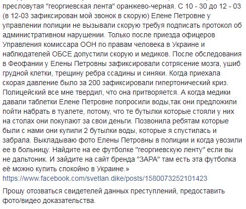 Затем радикалы и полиция начали ее избивать и скручивать руки. Затем повалили ее на пол - женщина ударилась головой об асфальт. После чего ее отвезли в отделение полиции. Ее потом отпустили, но в результате мама погибшего нардепа оказалась в больнице.