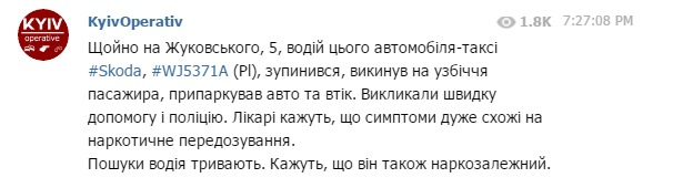 В Киеве объявлен план-перехват после того, как из такси выбросили пассажира с передозом