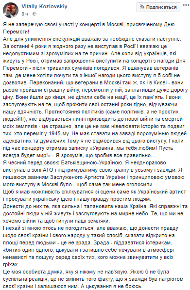 Сам Козловский на своей странице в Facebook написал, что не отрицает, что выступил в России и пояснил, почему сделал это.