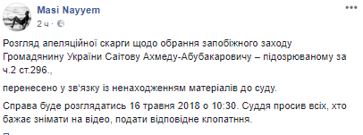 "Рассмотрение апелляционной жалобы относительно избрания меры пресечения гражданину Украины Саитову Ахмеду Абубакаровичу - подозреваемому по ч.2 ст.296, перенесено в связи с не поступлением материалов в суд", - сообщил Маси Найем в соцсети и добавил, что дело будет рассматриваться 16 мая в 10:30.