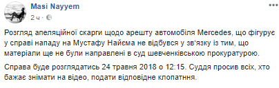 Как отметил Маси Найем, эту жалобу рассмотрят 24 мая в 12:15.