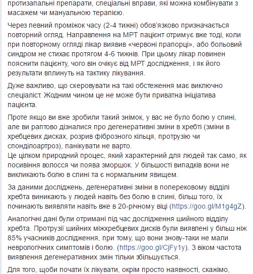 Ссылаясь на данные исследований, Супрун отметила, что дегенеративные изменения в поясничном отделе позвоночника возникают у людей даже без боли в спине, более того, их начинают проявлять уже в 20-летнем возрасте. "Протрузии шейных межпозвонковых дисков были обнаружены у более чем 85% участников исследования, при том, что они не имели неврологических симптомов и боли. С возрастом частота выявления дегенеративных изменений только увеличивается. необоснованно расширенные показания к МРТ позвоночника и неверная трактовка полученных результатов могут привести к тому, что начнется лечение "результатов МРТ", а не настоящей проблемы. Как следствие, назначение ненужных, порой дорогостоящих препаратов и процедур, иногда даже хирургического вмешательства. Как пациент, не стесняйтесь спрашивать вашего врача больше и никогда не принимайте самостоятельное решение по этому виду диагностики. Если вы врач - старайтесь больше объяснять своим пациентам чего вы ожидаете от результатов исследования", - рекомендует Супрун.