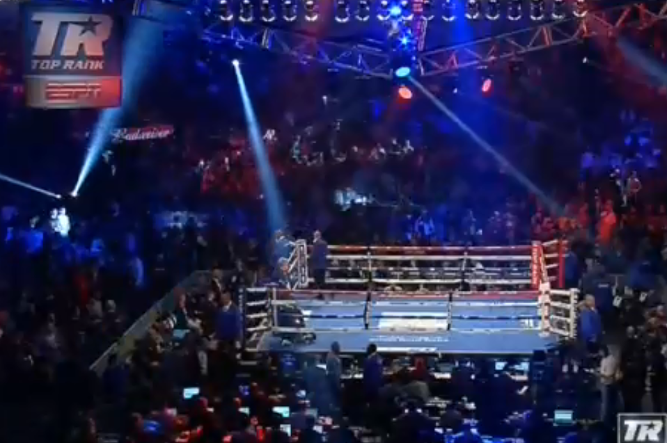 6-й раунд. Ломаченко побывал в нокдауне, пропустив сильный удар Линареса в подбородок. Попробовал развернуть ход боя венесуэлец, но быстро встал и продолжил поединок наш спортсмен.