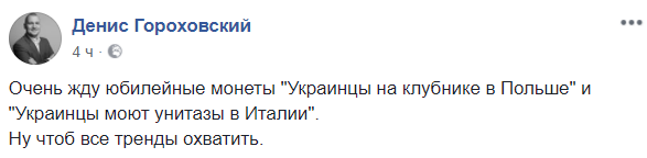 "Очень жду юбилейные монеты "Украинцы на клубнике в Польше" и "Украинцы моют унитазы в Италии". Ну чтоб все тренды охватить", - написал блогер Денис Гороховский.