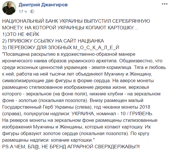 "Блин, вчера Украина порннау, сегодня золотая картошка. Кстати, что это за жёлтый монстр на монете хавает наше единственное достояние?", - пишет юрист Дмитрий Назарец.