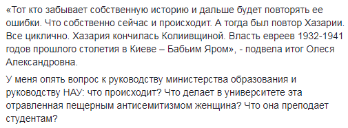 "У меня опять вопрос к руководству министерства образования и руководству НАУ: что происходит? Что делает в университете эта отравленная пещерным антисемитизмом женщина? Что она преподает студентам?" - отметил директор Украинского еврейского комитета Эдуард Долинский.