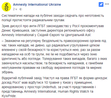 Об этом заявил заместитель директора регионального офиса Amnesty International по Восточной Европе и Центральной Азии Денис Кривошеев, в ответ на срыв радикальными группами дискуссии на тему, касающуюся прав, организованной в Киеве вечером 10 мая.