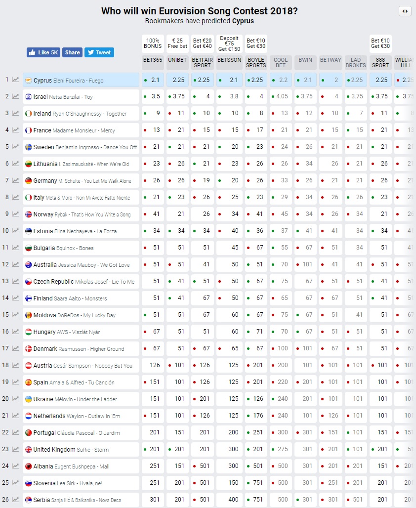 Согласно новым данным победителем в финале песенного конкурса станет участница от Кипра Элени Фурейри.