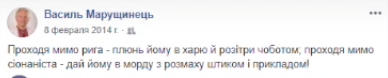 Среди прочих записей Марущинца можно увидеть такие антисемитские посты: "Ж@ды огласили войну Германии в 1934 году", "Боже, накажи ж@дов", "Бабий Яр. Не ж@дов в 1941 году, а украинцев 1918-1941 тут убито", "Ж@ды – говно".