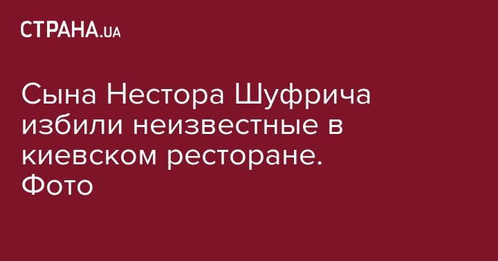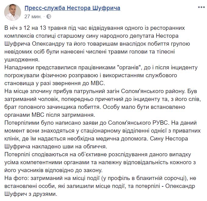 "Во время посещения одного из ресторанных комплексов столицы старшему сыну народного депутата Нестора Шуфрича Александру и его товарищам в результате избиения группой неизвестных лиц были нанесены многочисленные травмы головы и телесные повреждения", – говорится в сообщении.