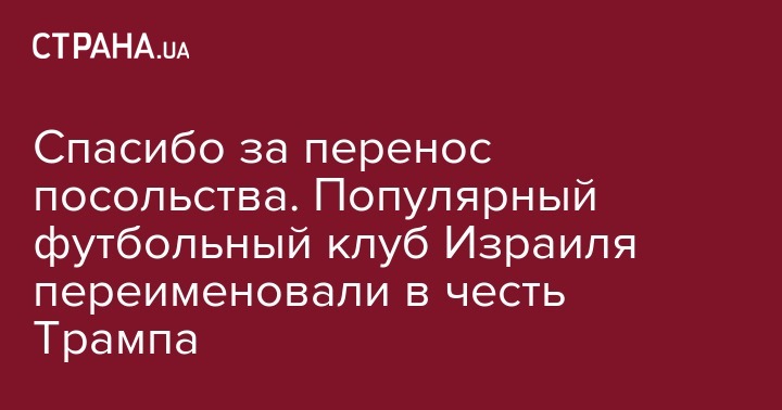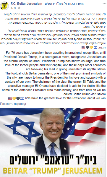 Таким образом футболисты высказали благодарность американскому лидеру за решение перенести американское посольство в Иерусалим. Теперь футбольный клуб носит название "Бейтар Трамп Иерусалим". Об этом сообщается на его странице в Facebook.