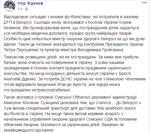 "Связался с главой Сумской областной государственной администрации Николаем Клочко.... В Беларусь из Сум выехал специальный транспорт для доставки тела погибшего юного футболиста в Украину. На место также выехал руководитель аппарата с начальником управления здравоохранения Сумской ОГА и главным областным врачом", - сообщил министр на своей странице в соцсети Facebook.