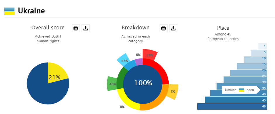 Украина, по результатам исследования, получила оценку 20,95% и оказалась на 36 месте, между Румынией и Литвой соответственно. В то же время, несмотря на низкий рейтинг, исследователи отметили прогресс государства в обеспечении равенства прав ЛГБТ.