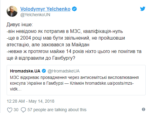 "Квалификация - ноль - еще в 2004 году должен был быть освобожден, не пройдя аттестацию, но спрятался за Майдан - неужели в течение почти 14 лет никто этого не заметил и еще и отправили в Гамбург?", - написал представитель Украины в ООН.