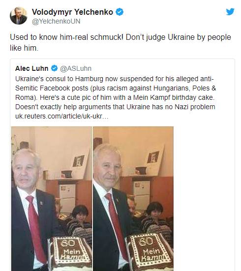 Также он сделал перепост скриншота, на котором украинский дипломат позирует с тортом с надписью 60 лет Mein Kampf.