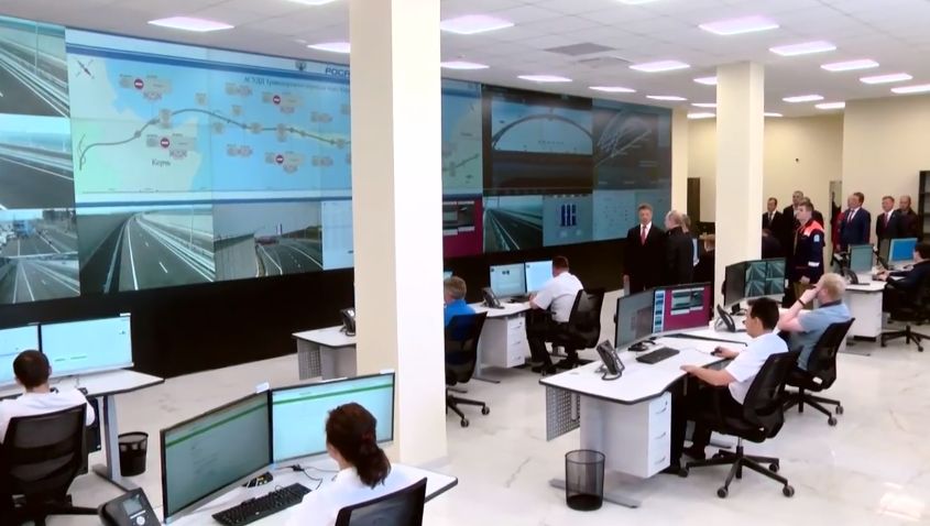 14.35 Владимиру Путину в центре управления производством рассказывают об устройстве моста у большого экрана, на котором показан его план.