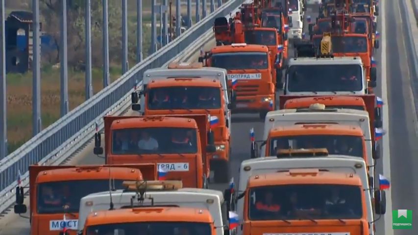 15.05 Колонна добралась через Крымский мост до Керчи, там ее уже ждут строители и зрители.