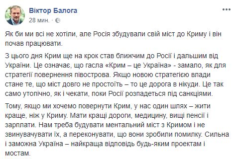 С этого дня Крым еще на шаг стал ближе к России и дальнейшим от Украины. Это означает, что лозунги "Крым - это Украина" - мало, как для стратегии возвращения полуострова. Если новой стратегией власти станет то, что мост долго не простоит - это дорога в никуда. Это так же утопично, как и ждать, пока в России распадется под санкциями.